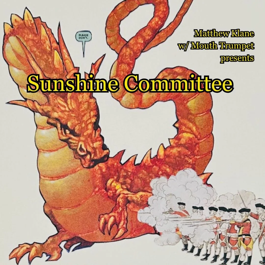 Sunshine Committee, the second album by Matthew Klane with Mouth Trumpet, was released in March 2026. The band: Shawn McCann (guitar, banjo), Chris Gockley (bass), and Louis Apicello (trumpet, squeezebox, bag of tricks). Recorded and produced again by Jimi W. in Mechanicville, NY and mastered by Sam Torres of Polymouth Mastering in Troy, NY. Listen to the record on Bandcamp, Spotify, Apple Music, or any of your streaming platforms. To book a show, query matthewklane at gmail dot com.